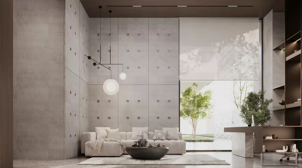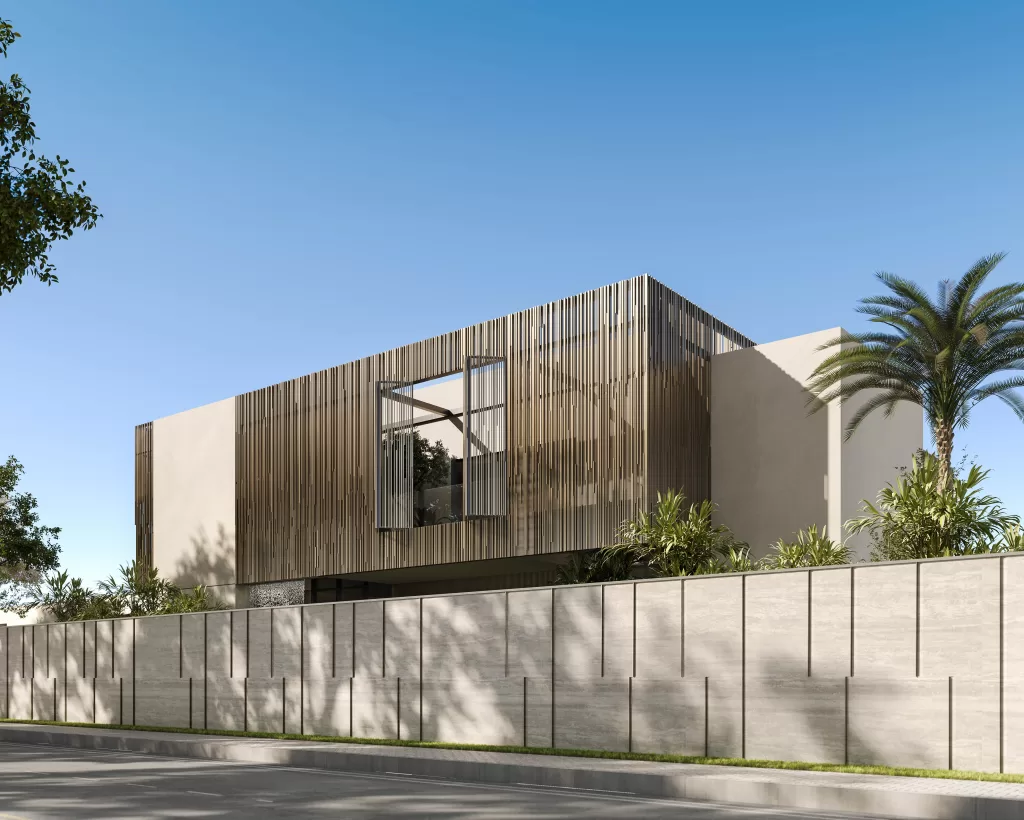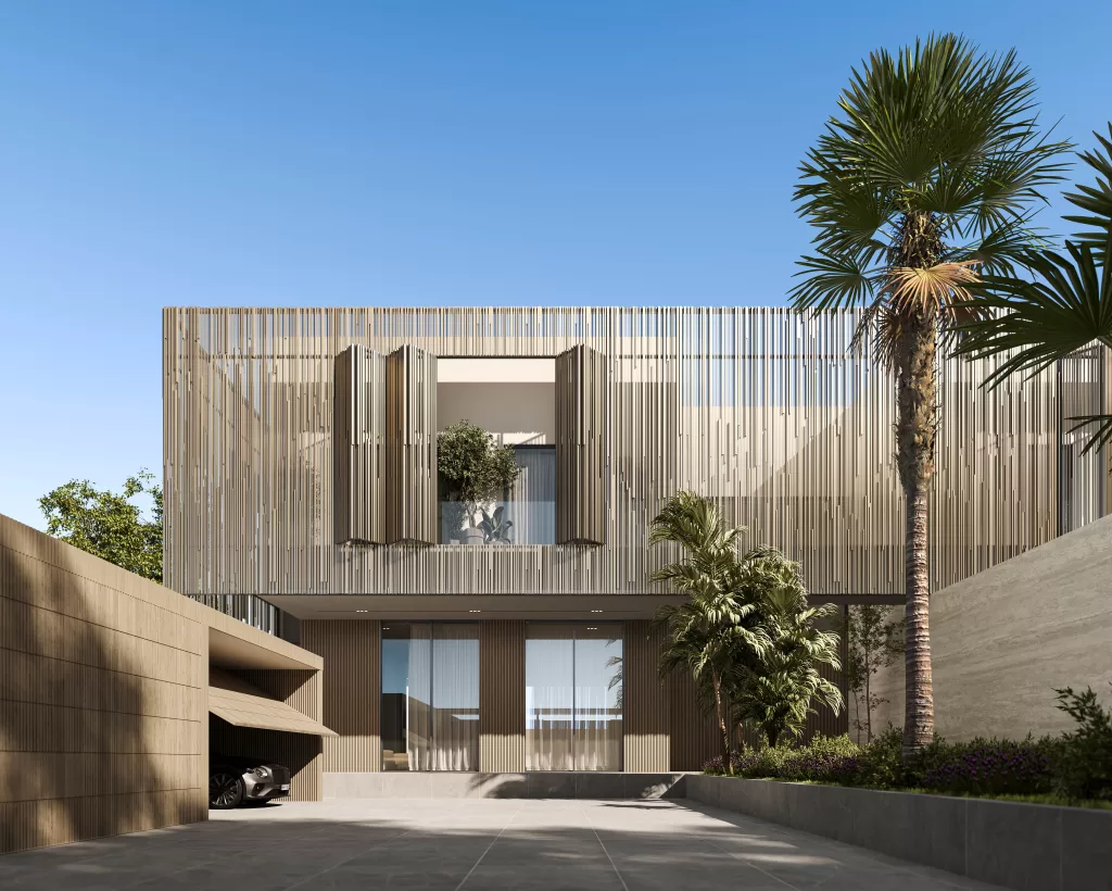 This luxury villa in Al Suyoh, Sharjah, designed by MEMAR Architecture, showcases a masterful blend of slatted wood, architectural concrete panels, and expansive floor-to-ceiling glass, creating a refined composition of elegance, privacy, and energy-efficient performance. The sustainable wooden slats enhance thermal insulation and promote natural ventilation, while adding rhythm and warmth to the architectural design. Concrete finishes deliver structural durability and thermal efficiency, reflecting the villa’s eco-conscious construction approach. A serene custom-designed outdoor waterfall, another signature of MEMAR’s nature-inspired approach, enriches the modern villa exterior with a sense of calm and fluidity. The result is a minimalist architectural style that feels private, peaceful, and luxuriously contemporary