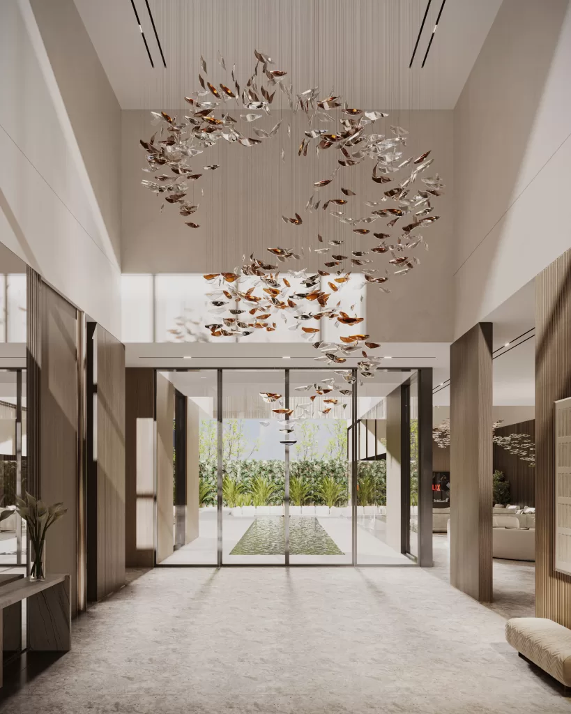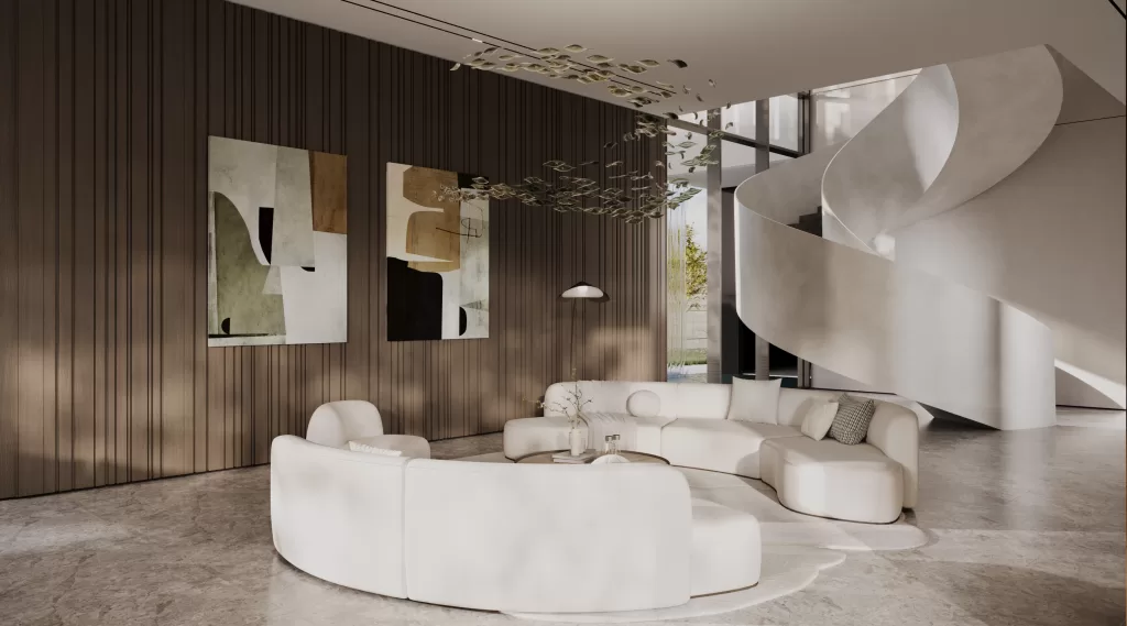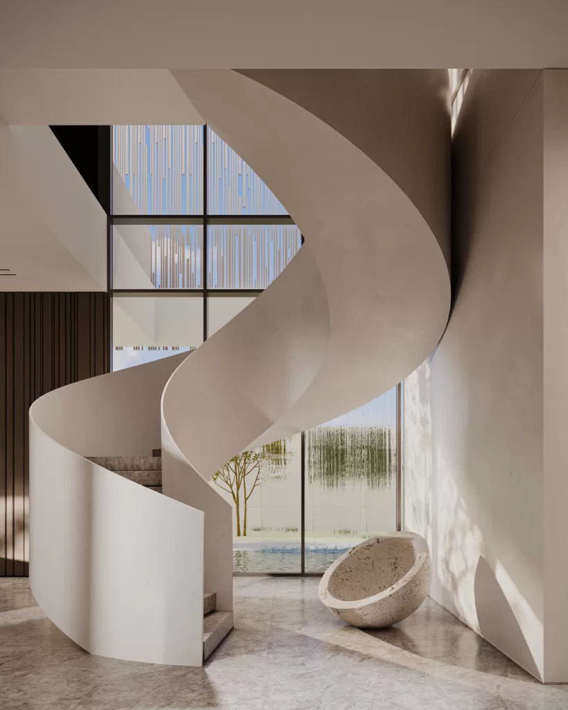 Inside, a grand double-height entrance is framed by light, movement, and visual flow. Designed by MEMAR Architecture to celebrate openness and refinement, the foyer features an elegant circular staircase, a calming neutral palette, and abundant natural light, setting the tone for the villa’s open-plan interior design. A reflective water feature at the entrance enhances the sense of luxury and tranquility, welcoming guests with a thoughtfully curated ambiance.
