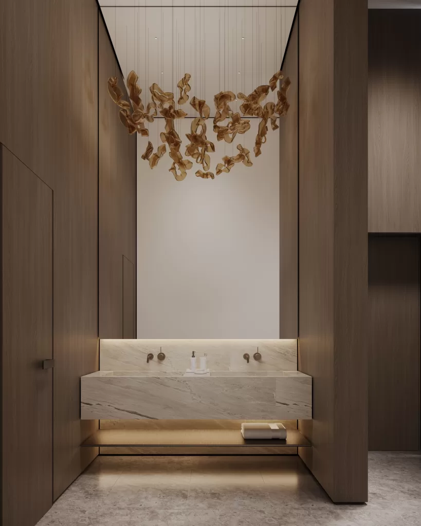 The powder room, envisioned by MEMAR’s interior team, features bold stone finishes, a floating vanity, and sleek fixtures, delivering high-impact design in a compact footprint