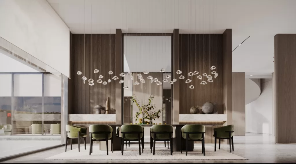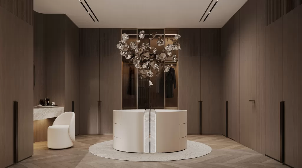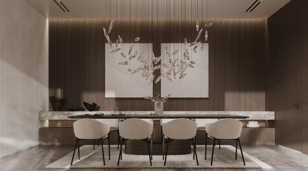 In the dining area, a sculptural chandelier and the combination of warm oak and travertine finishes define a setting that is both dramatic and functional, hallmarks of MEMAR Architecture’s residential design ethos