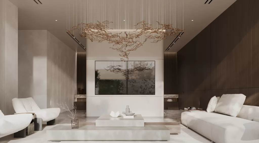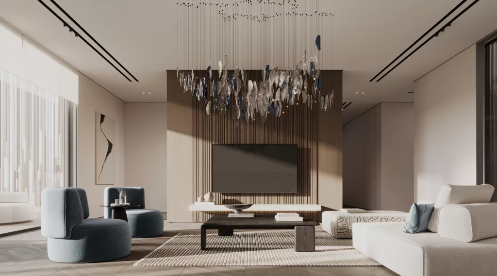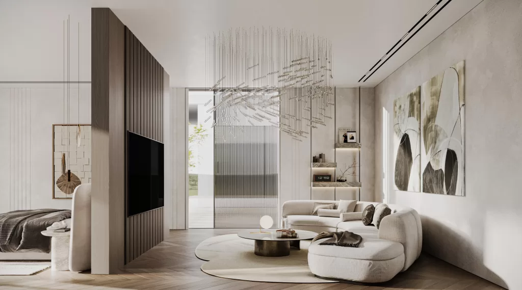 The family living area continues MEMAR’s philosophy of harmony and comfort, with custom low seating, soft textures, and light wood finishes. Contrasting feature walls and panoramic windows achieve a balance of intimacy and openness