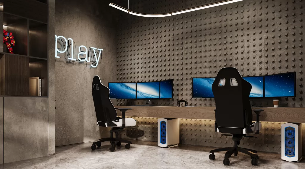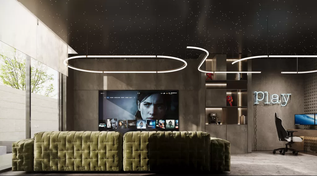 A cozy gaming room, created with all ages in mind, features built-in cushioned seating, sound-absorbing materials, and soft lighting, delivering the perfect space for leisure and digital entertainment