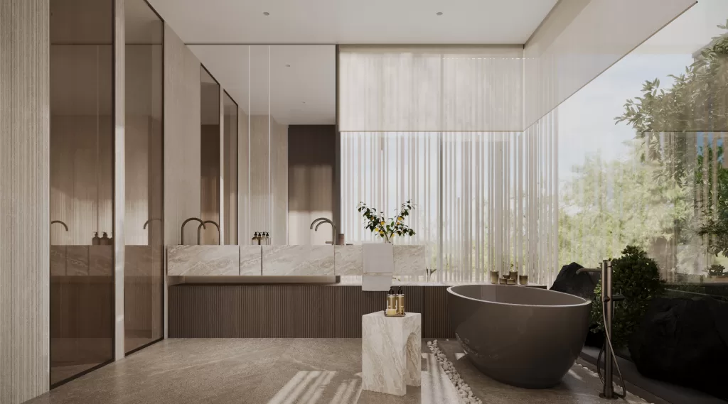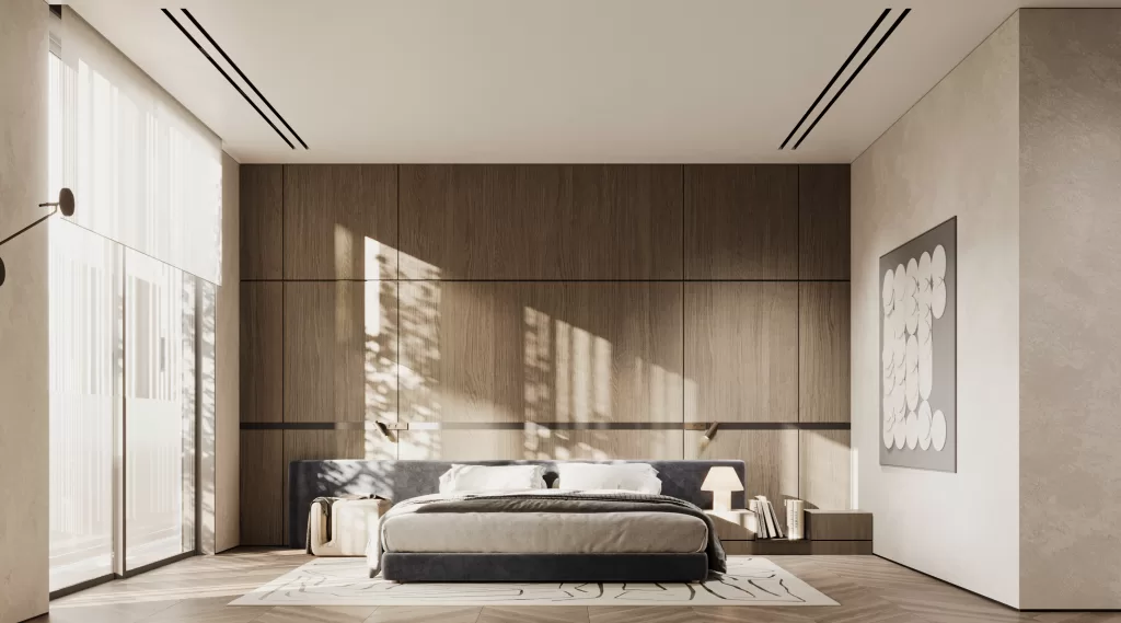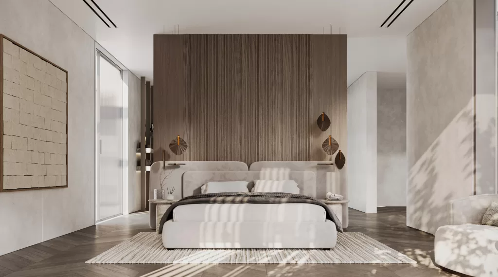 The master suite, a peaceful sanctuary curated by MEMAR, features a soft neutral palette, layered fabrics, and refined lighting. A bold stone accent wall, pendant lighting, a walk-in wardrobe, and a luxurious ensuite transform this into a signature master