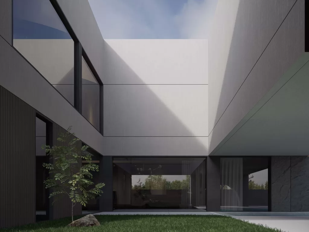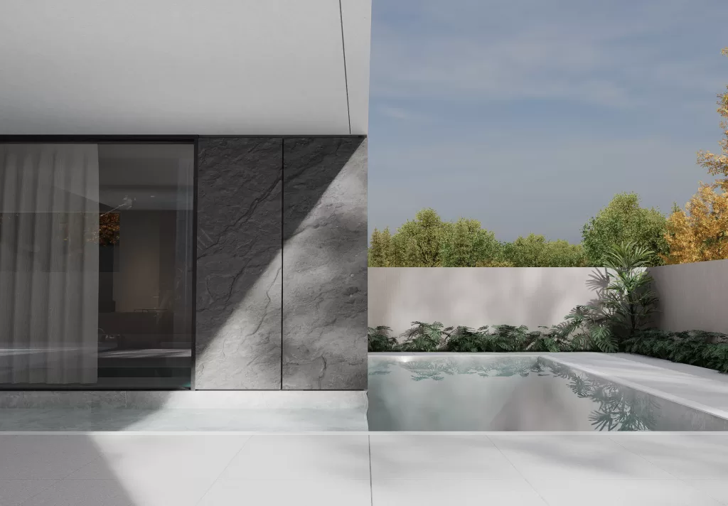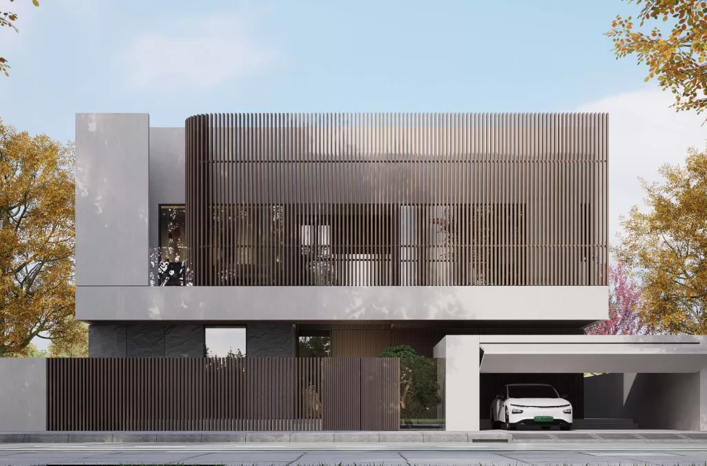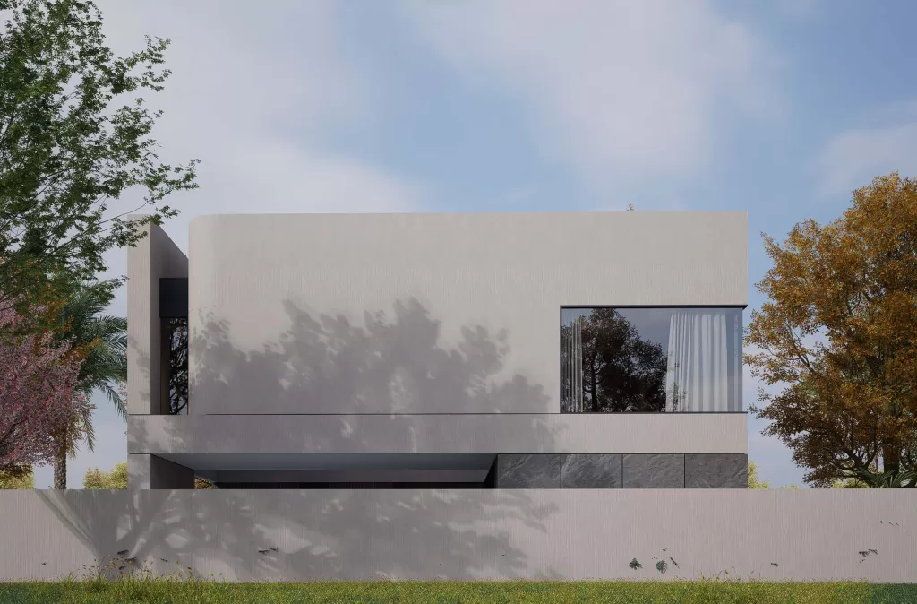 The villa’s exterior expresses a dialogue between structure, material, and proportion. The composition combines off-white plaster with gray stone, warm wood panels, and sleek black metal details, balanced by expanses of tempered glass. The interplay of solid and void, light and shadow, creates a rhythmic facade that evolves throughout the day. By night, subtle architectural lighting accentuates the villa’s clean lines and layered volumes, underscoring its contemporary architectural identity.