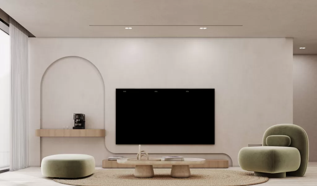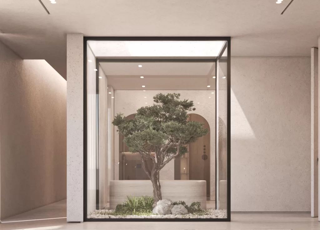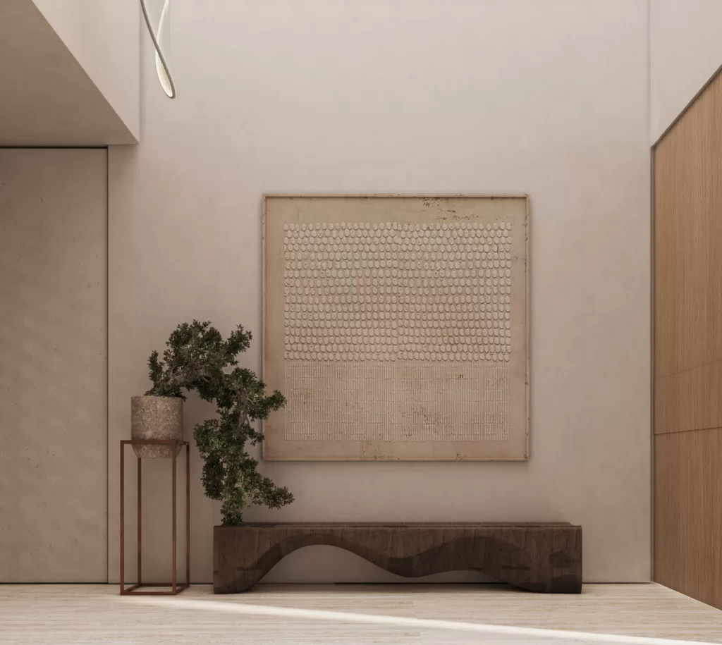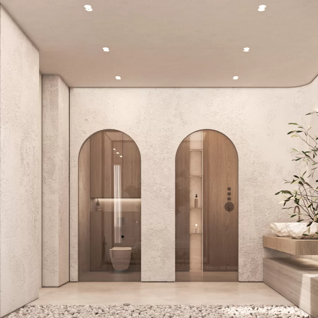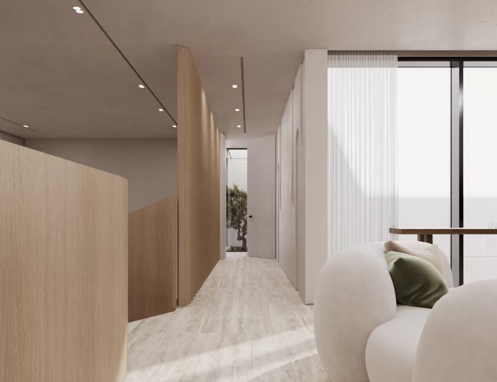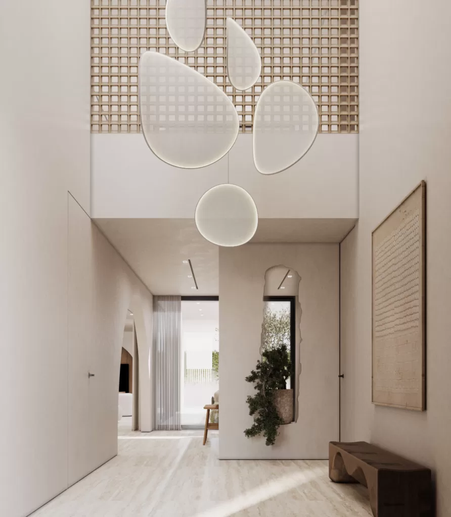 The entrance establishes the villa’s architectural tone, a seamless transition from exterior calm to interior refinement. Natural light filters through framed openings, softly illuminating stone and timber surfaces. The use of neutral hues and tactile finishes creates a balanced composition of openness and privacy. As the first spatial experience of the home, it embodies the project’s central design philosophy: serenity through precision and proportion.