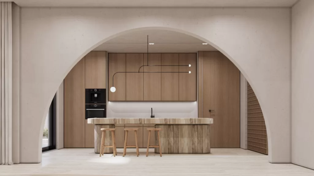 The show kitchen embodies the essence of modern interiors: functional, inviting, and meticulously detailed. A palette of light wood, travertine textures, and refined metallic accents defines a warm, contemporary aesthetic. Integrated lighting highlights craftsmanship and spatial clarity, while the layout encourages interaction and everyday comfort. This space reflects MEMAR’s vision of bespoke residential design, where practicality is elevated through material harmony and thoughtful design.