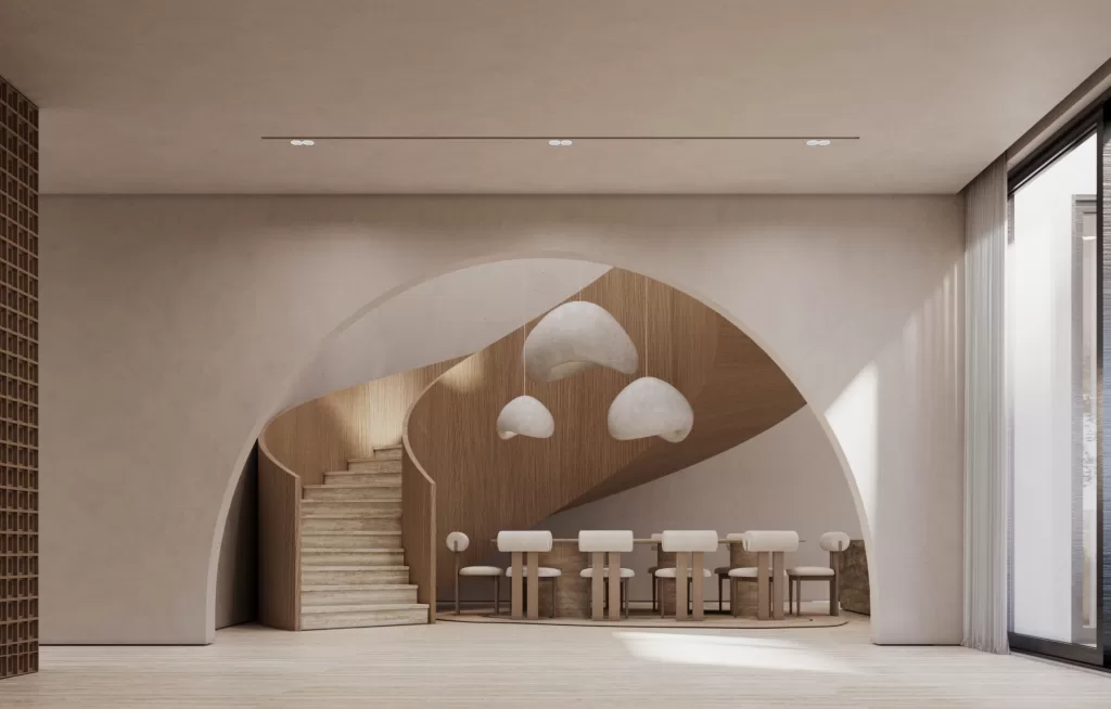 The central staircase functions as both structure and sculpture. Floating in light, its linear geometry and refined material palette, combining light wood, glass, and subtle concrete tones, create a visual and spatial connection across levels. The design transforms movement into experience, reinforcing the villa’s narrative of understated luxury and architectural elegance.