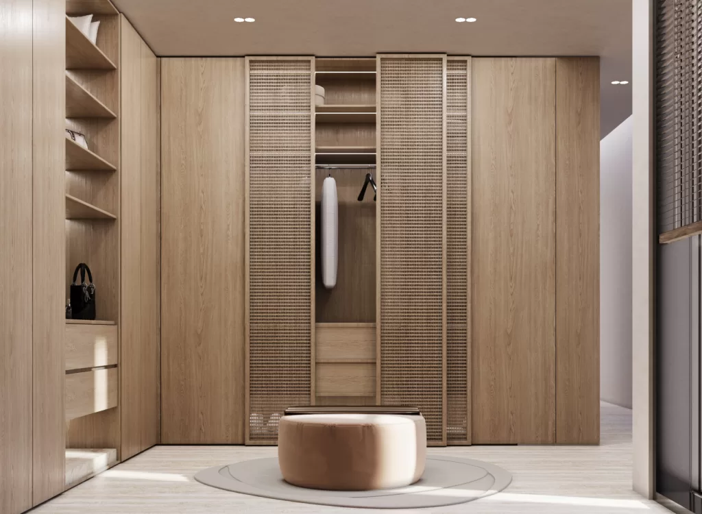 The master suite captures the villa’s essence of refined privacy and comfort. Warm wood tones, soft textiles, and a restrained palette evoke a feeling of retreat. The spatial organization flows seamlessly between dressing, sleeping, and bathing areas, creating a rhythm of relaxation. Natural light becomes an architectural feature, enhancing texture and depth. The result is an environment of discreet luxury, aligning with MEMAR’s vision for bespoke Dubai villa design.