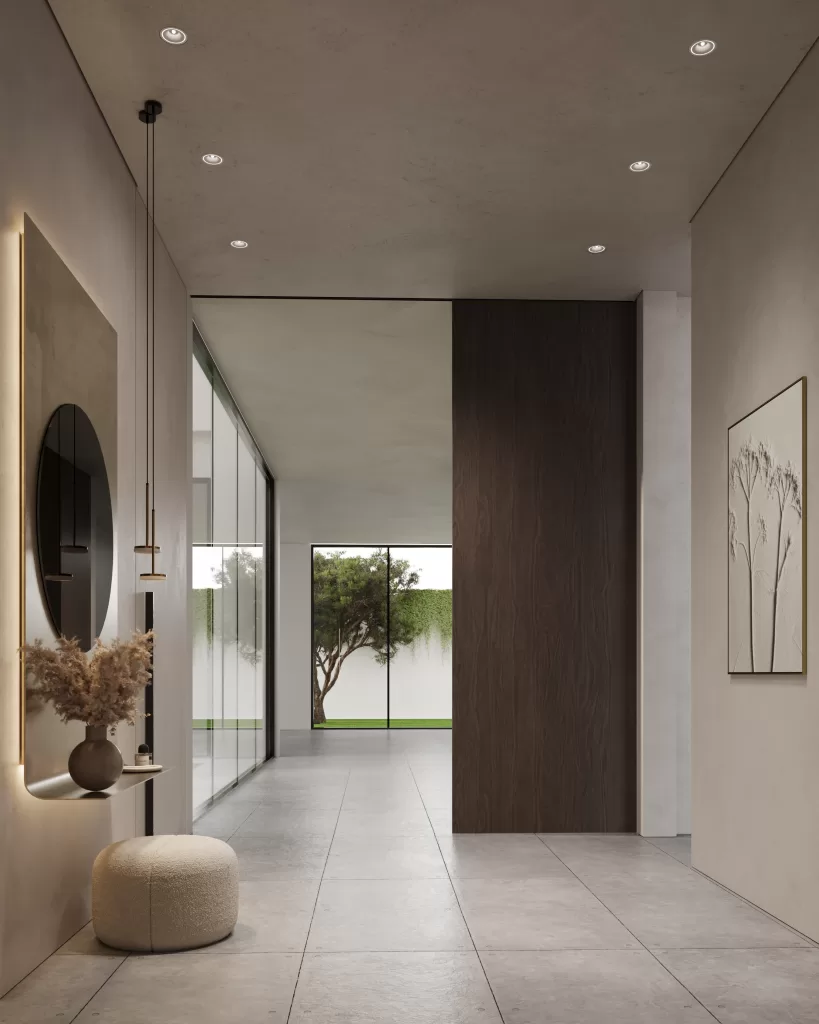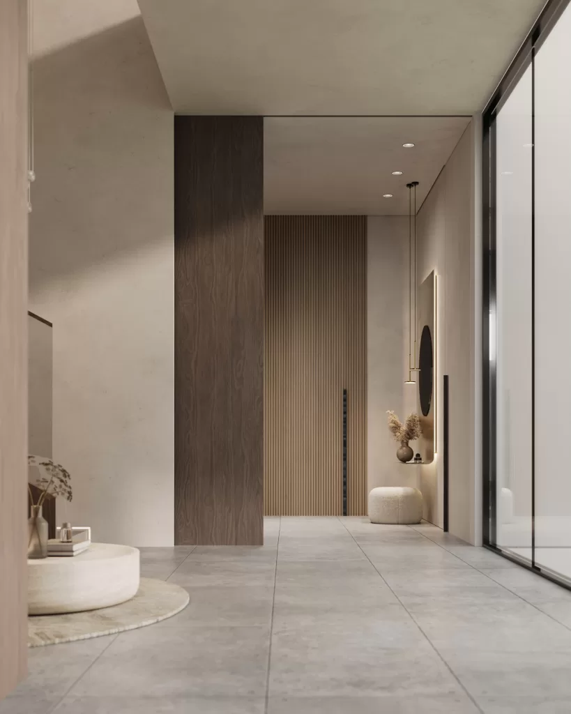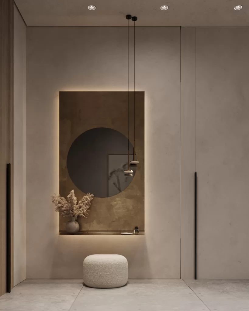The earthy wood grains create a sense of grounding, while the gentle play of light adds depth and character to the space. A striking circular mirror, thoughtfully placed, captures the ambient light and subtly reflects the surrounding elements, creating a feeling of openness and serenity.