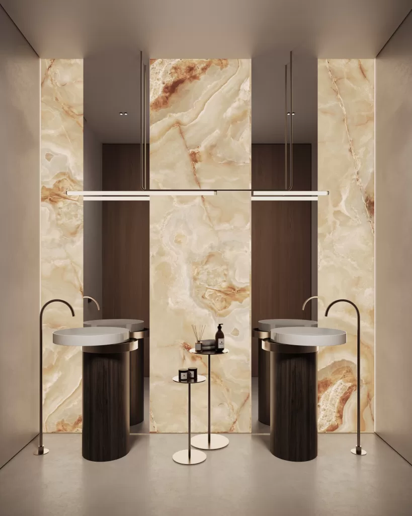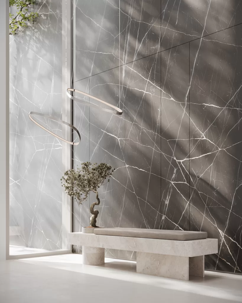 Dark marble wraps the façade, creating depth and drama, while soft lighting and architectural shadows enhance the interplay of materials. Sleek modern lines meet the organic veining of natural stone, resulting in a powerful yet balanced welcome experience that embodies quiet luxury.