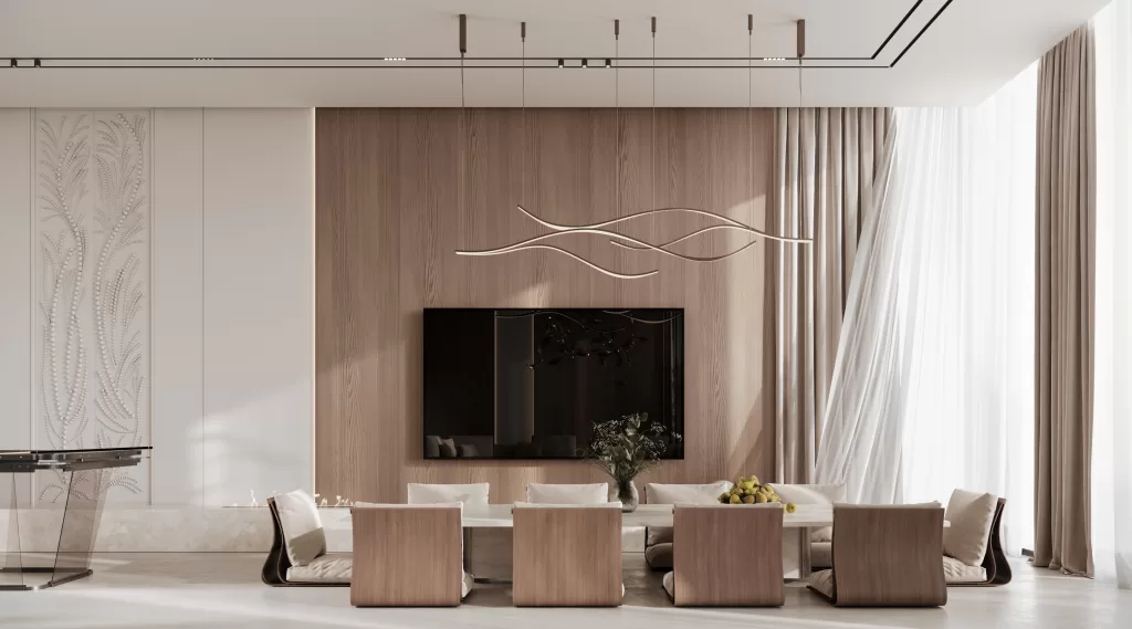 Slatted wood introduces tactile richness, enhancing the dining room’s aesthetic with its natural warmth and sophisticated charm. This is complemented by a curated mix of recessed lighting and pendant lighting, casting a soft, ambient glow that enhances the intimate beauty of every corner while adding depth and luxury to the space.