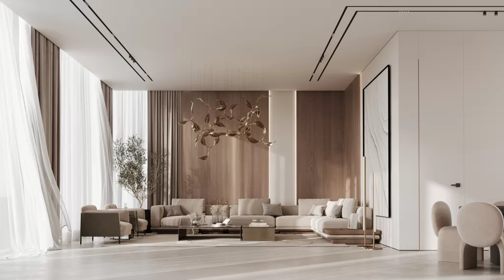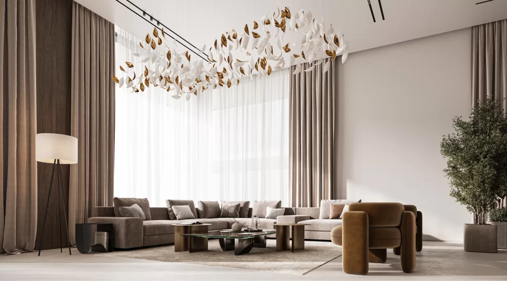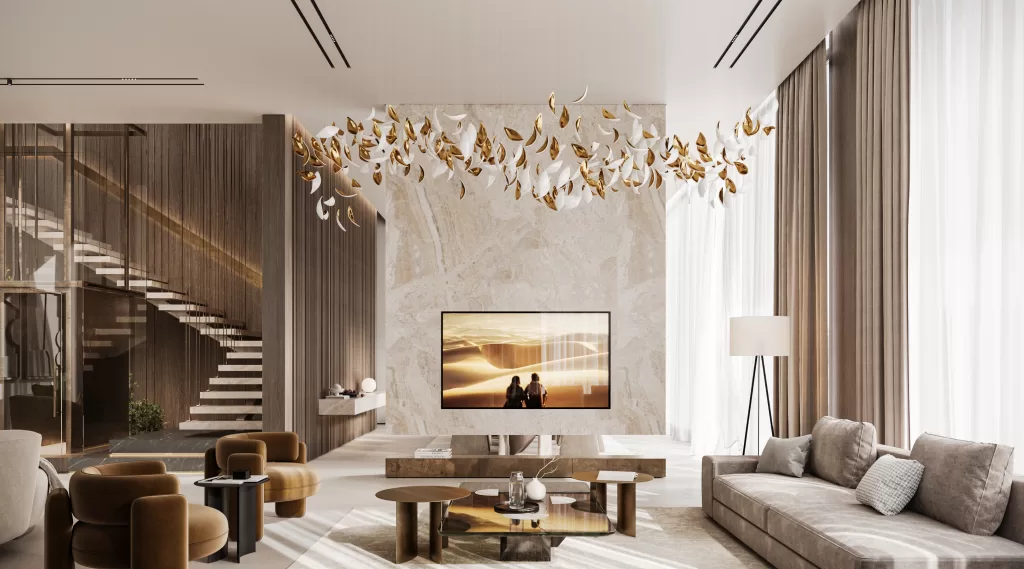 A floating marble TV wall anchors the room with sculptural presence, while golden lighting elements add a soft, ambient glow that enhances the richness of surrounding materials. Floor-to-ceiling curtains frame the space, welcoming natural light and softening the atmosphere with elegance.