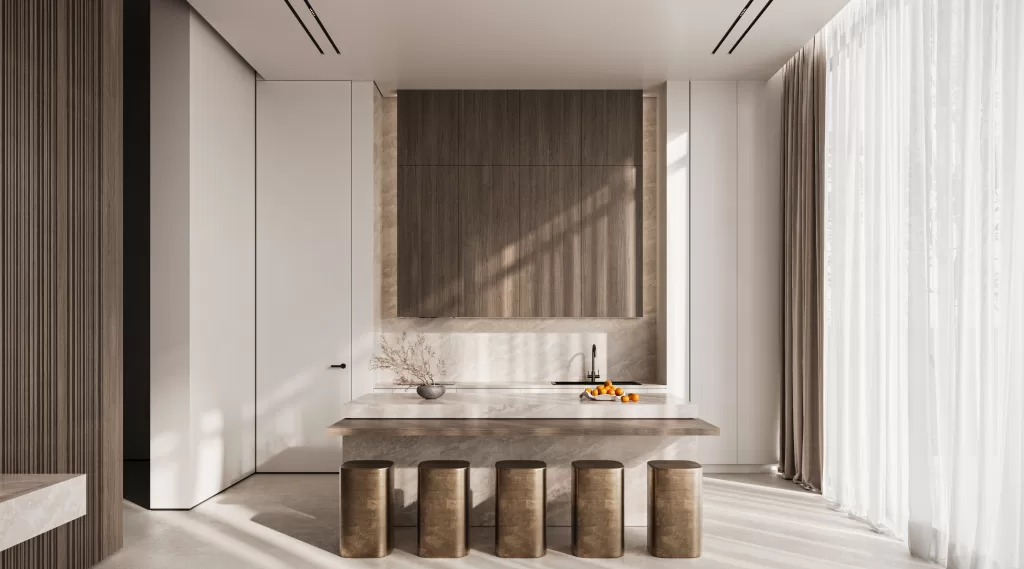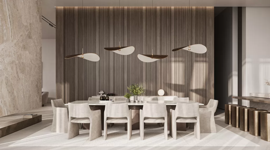 The design transforms the dining area into more than just a room; it becomes a serene retreat, inviting conversation, connection, and moments of quiet luxury. Every detail is thoughtfully curated to create an inviting atmosphere that blends modern design with elegant living.