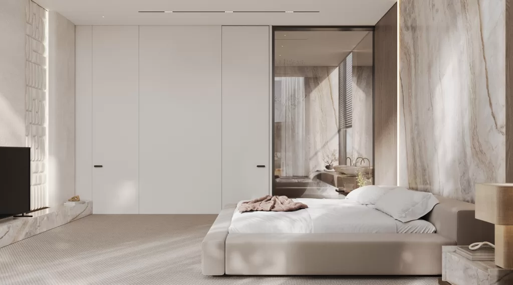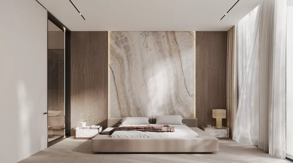 Wrapped in warm marble and rich wood paneling, this master bedroom embodies quiet sophistication where natural materials meet thoughtful design. Floor-to-ceiling windows invite natural light to gently flood the space, creating an atmosphere that feels alive, calm, and deeply connected to its surroundings.