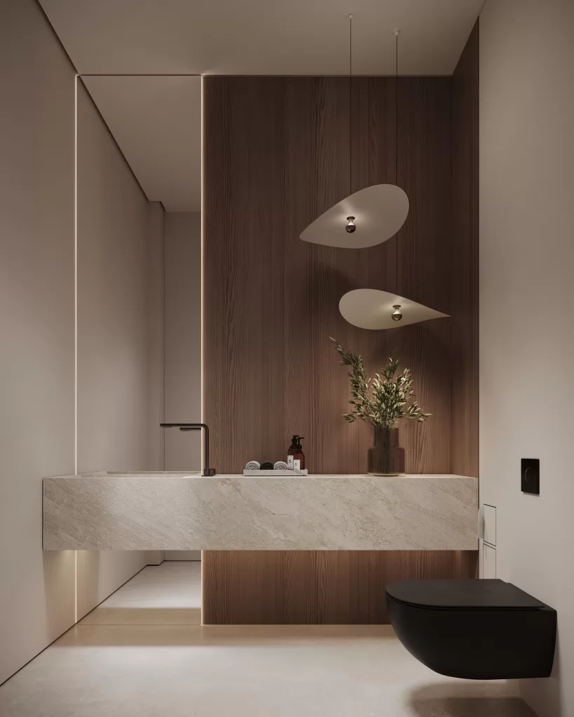 Elegant Powder, Designed by MEMAR Architecture, this powder room unfolds in quiet harmony, where a seamless layout, curated lighting, and a palette of warm marble and rich wood come together to create a serene, grounded experience.